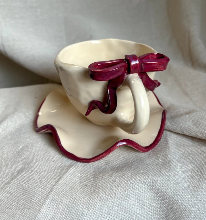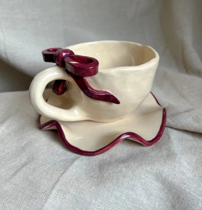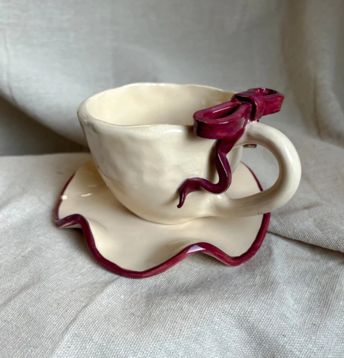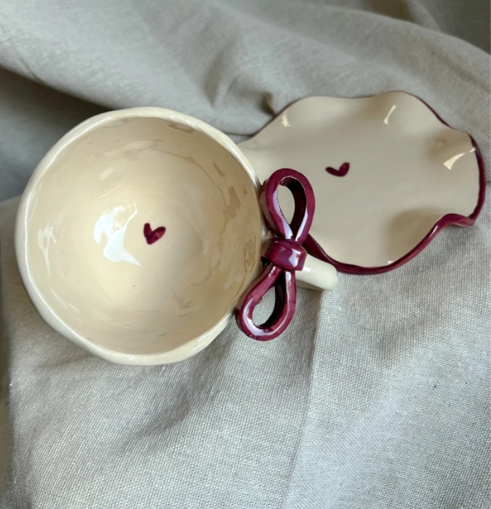 Ceramic cup with plate, handmade, with ribbon.